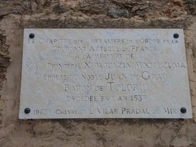 Quien se acerque hoy a Toloriu, ese misterioso pueblo de 14 habitantes, se encontrará con una placa, puesta en el portal de la iglesia, donde dice que la princesa Xipaguazin Moctezuma, hija del emperador mexicano y esposa de Juan de Grau, barón de Toloriu, murió en el año 1537. Por si esto fuera poco, la placa está escrita en francés, firmada por los «Caballeros de la orden de la corona azteca de Francia» y por un tal Chevalier L. Vidal Pradal de Mir, que es, al parecer, uno de los heterónimos de SMI príncipe Guillermo III de Grau-Moctezuma, descendiente del barón de Toloriu, que en los años sesenta del siglo veinte hizo su agosto en Barcelona vendiendo títulos nobiliarios y condecoraciones de la corona azteca a la gente que deseaba, y podía pagarse, un sitio en la realeza.