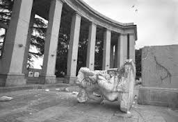 L’1 de juny de l’any 2001 la Plataforma Antifeixista de Barcelona du a terme una acció contra el monument, que es trenca i és retirat. El dijous 28 de juliol de 2005 comença l’enderroc de la columnata. En el seu lloc l’Ajuntament projecta crear “un espai de trobada cívica, amb un projecte de l’arquitecte Helio Piñón que inclou un prisma de vidre de cinc metres d’alçada i una llosa irregular amb perfils d’acer que brillaran de dia amb el sol i de nit amb fibra artificial”. Aquest projecte no es realitza, per contra es planten parterres i arbres seguint la traça del monument eliminat.