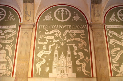 Cuando uno sube a Montserrat desde MOnistrol, por los diferentes senderos, al llegar arriba debe buscar signos del sentido Jacobeo de Montserrat. En el Monasterio encontrará en los atrios una bonita referencia a los peregrinos compostelanos.
