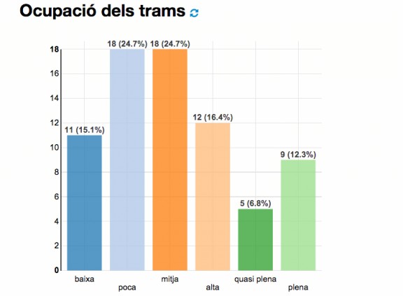 A 31 d´agost el estat de la «V» de l´onze de setembre està de la segünt manera: 29 dels 73 trams tenen una ocupació «baixa» o «poca«. Hi ha 18 trams amb ocupació «mitja», 12 alta i 14 «plena» o «quasi plena