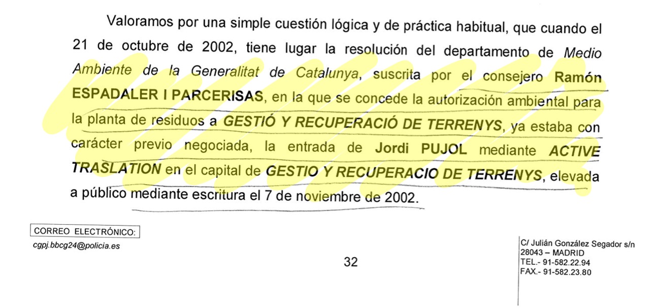 En el último informe de la Policía en manos del juez Ruz, los investigadores aseguran: «Valoramos como una simple cuestión lógica y de práctica habitual que cuando el 21 de octubre de 2002, tiene lugar la resolución del departamento de Medio Ambiente de la Generalitat de Catalunya, suscrita por el consejero Ramón Espadaler i Parcerisas, en la que se concede la autorización ambiental para una planta de residuos (…) ya estaba, con carácter previo negociada, la entrada de Jordi Pujol”.