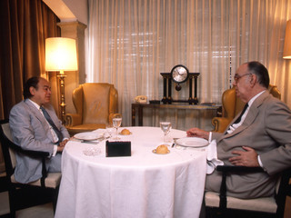 Jordi Pujol y Camilo José Cela, durante la entrevista de 1984 en uno de los salones del Palacio de la Generalitat de Cataluña
