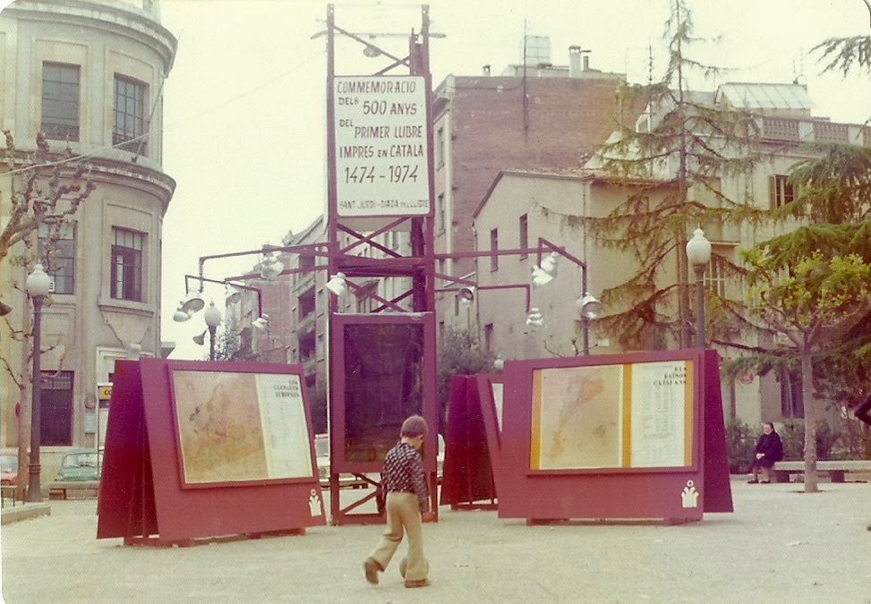 Per la diada de Sant Jordi del 1974 l’Ómnium Cultural va organitzà una exposició al mig de la plaça Vella per commemorar els 500 anys del primer llibre imprés en català. 1471-1974.