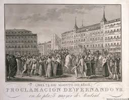 Blai Ametller i Rotllan (1768-1841)24, quien también grabó estampas de exaltación patriótica como la calcografia titulada Dia 24 de Agosto de 1808. Proclamacion de Fernando VII en la plaza mayor de Madrid tuvo una actitud parecida a Planella, ya que durante la contienda se mostró favorable a los franceses, mientras que en 1815 se convirtió en grabador de Cámara de Fernando VII, produciendo estampas de clara significación antinapoleónica.