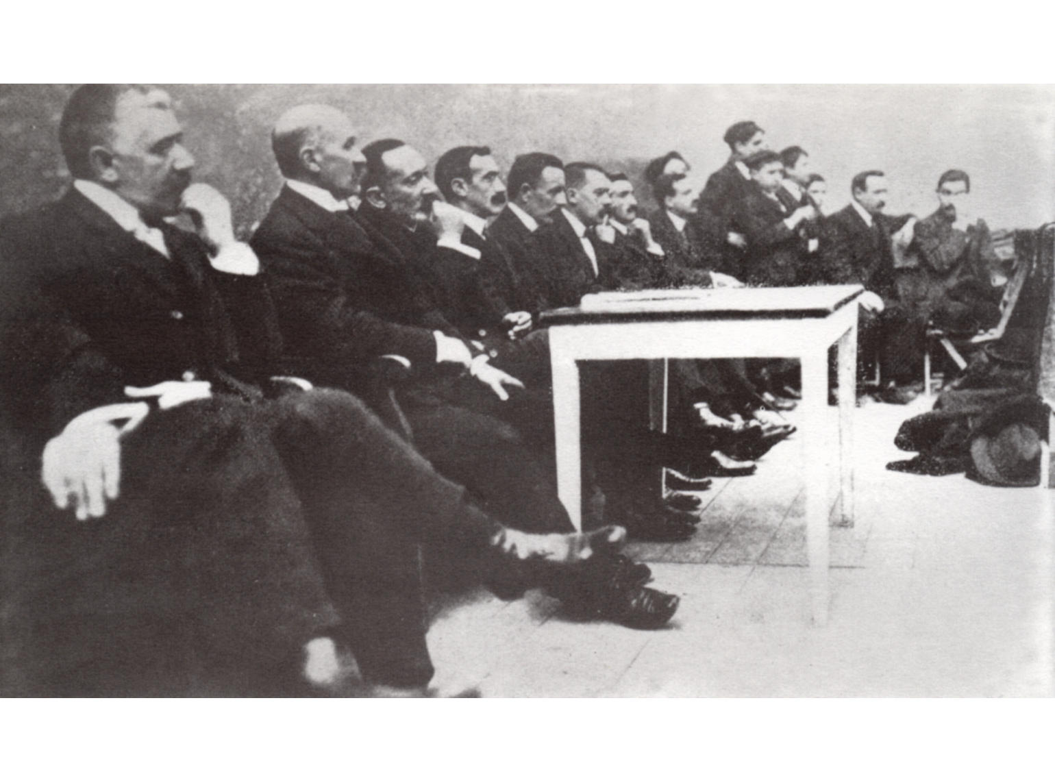 Luis Arana Goiri (3º por la izquierda), presidiendo un mitin contra la laicidad en las escuelas en 1910