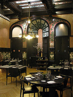 En los comedores del restaurante, se puede apreciar la gran ornamentación que contienen, un mural en el fondo con sirenas, arrimaderos de madera tallada con cerámica vidriada decorada con escudos de ciudades de España, vitrales y lámparas de metalistería.