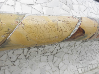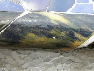 Una altra curiositat és que alguna d’aquestes inscripcions estan del revés i cal girar el cap per poder-les llegir correctament. Josep Maria Carandell i Pere Vivas, en el seu llibre “Park Güell. Utopía de Gaudí” creuen que la forma sinuosa del banc al·ludeix a la serp bíblica, encarnació de la luxúria i el pecat, i que la Mare de Déu trepitja el banc en una mena de metàfora de la salvació de la humanitat a mans de la Verge Maria.