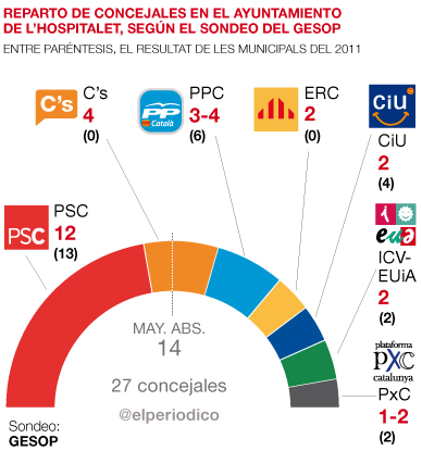 Sondeo electoral del Periodico para L’Hospitalet de Llobregat: PSC 12 Ciutadans 4 PP 3-4 ERC 2 CiU 2 ICV 2 PxC 1-2 Fuente: http://www.elperiodico.com/es/noticias/politica/marin-apenas-cae-lhospitalet-ciutadans-crece-costa-del-4193105