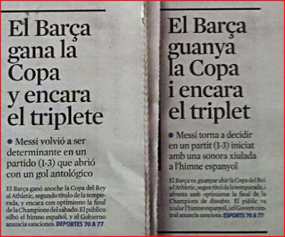 E aquí un ejemplo. Tal como se puede apreciar en la imagen, la edición en castellano tenía un subtítulo acerca de la final de Copa entre el Barça y el Athletic, el que se destaca lo futbolístico. En la edición en catalán se resalta la «pitada» contra el himno español.