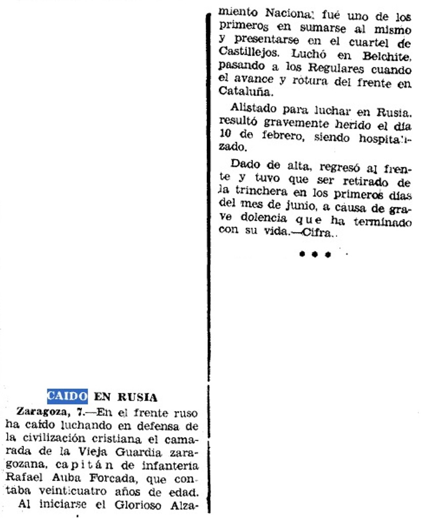 El seu fill fou el falangista Rafael Aubà i Forcada (Zaragoza 1923- Riga 1943), capità d´Infanteria, voluntari franquista a les “Brigades Navarres” durant la guerra civil, lluità a Belchite i fou “Camisa Vieja”. Voluntari a la “División Azul”, va morir el 9 de Juny de 1943 a l´Hospital de Riga, desprès de patir ferides a la batalla de Krassny Bor.
