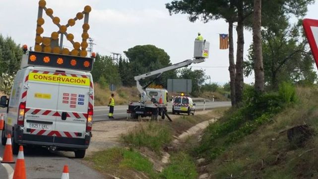 Tècnics dels equips de conservació de carreteres de Fomento, van retirar les banderes independentistes de l’entrada de Valls.