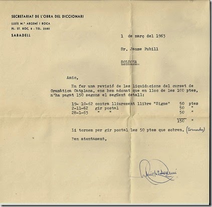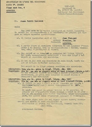 Era l’any 1962, la matrícula costava 100 pessetes i donaven totes les facilitats per poder-lo fer. Encara guardo els fulls d’inscripció, el llibre SIGNE:Normes pràctiques de gramàtica catalana(1962) i les lliçons corregides pel professor que em van assignar (el Sr. Joan Blanquer, també de Sabadell). M’ha fet gràcia fer-ne un escaneig per guardar-los i poder-vos-els mostrar.