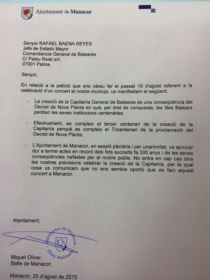 Mitjançant una carta oficial Miquel Oliver, batlle de Manacor, de Més per Manacor/ER, li ha comunicat al Comandant General de Balears, Senyor Rafael Baena Reyes Cap d’Estat Major que l’ajuntament dins dels actes programats per commemorar els 300 anys de l’aplicació del Decret de Nova planta no contempla, ni els «sembla oportú» que la Capitania General de Balears celebre un concert amb la banda militar per commemorar, alhora també el 300 anys de la creació d’aquesta.