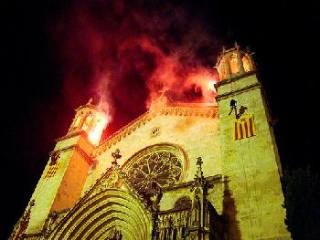 Me permitirá que explique brevemente las características del acto. Entrada la noche se presentará ante la portada principal de la basílica un séquito de diablos con antorchas. Después bajo el redoble ensordecedor de los tambores, unos escaladores treparan con la ayuda de unas cuerdas hasta las torres de la iglesia, prenderán fuego en su interior hasta producir una gran humareda y profanarán el templo colgando una bandera estelada de cada torre, de donde no las retirarán hasta unos cuantos días después de terminadas las fiestas. Todo ello quizás no con la complicidad pero sí, evidentemente, con la connivencia del obispado, ya que los hechos hace más de una década que se repiten año tras año y en todo este tiempo no ha trascendido que se haya presentado ninguna denuncia ante el juzgado o la policía, ni que algún representante del obispado o de la parroquia haya mostrado públicamente su disconformidad.