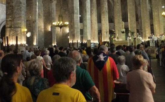 Personas con la estelada colgada en la espalda en la Misa del 11 de septiembre de 2014, presidida por Sistach