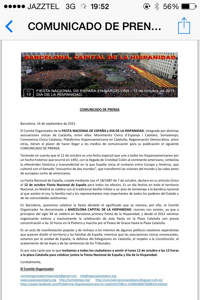 Comunicado de prensa de las asociaciones convocantes del 12-0 Por Somatemps el 18 septiembre, 2015 • ( 1 ) Comunicado20150904 Comparte esto: Haz clic para compartir en X (Se abre en una ventana nueva) X Haz clic para compartir en Telegram (Se abre en una ventana nueva) Telegram Haz clic para enviar un enlace por correo electrónico a un amigo (Se abre en una ventana nueva) Correo electrónico Haz clic para compartir en Facebook (Se abre en una ventana nueva) Facebook Haz clic para compartir en WhatsApp (Se abre en una ventana nueva) WhatsApp Haz clic para compartir en LinkedIn (Se abre en una ventana nueva) LinkedIn Haz clic para imprimir (Se abre en una ventana nueva) Imprimir Me gusta Cargando...‹ Fora símbols racistes a Barcelona: Fora el monument a Allende. Això és La TracaIncreible pero cierto: Jordi Sàntxes (ANC) pide boicotear a TV3%. ¡Estos cebolletas están locos! ›Categorías:ACTIVIDADES
