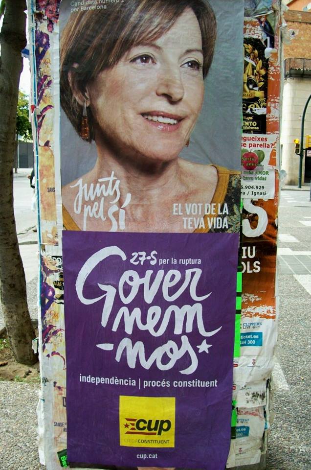 Sospechosamente las CUP y Junts pel Sí, se respetan los espacios electorarles, no se tapan los carteles electorales (primera vez en la historia) y comparten la misma agencia de publicidad que ha utilizado estilos muy semejantes para las dos campañas: en tipografía y colores. En política hay pocas casualidades.
