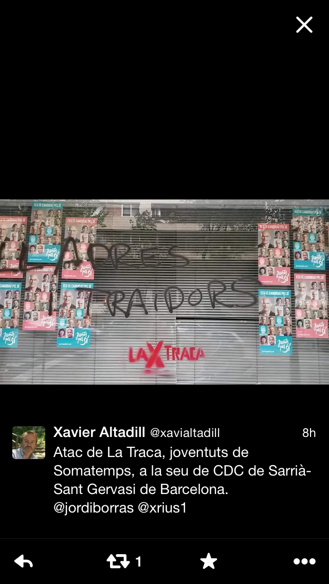 La Traca ataca, pero desconocemos su procedencia. Por Somatemps el 7 octubre, 2015 • ( 1 ) Twitt que recoge una hipótesis de trabajo interesante, pero que no podemos refutar en ninguno de los sentidos Comparte esto: Haz clic para compartir en X (Se abre en una ventana nueva) X Haz clic para compartir en Telegram (Se abre en una ventana nueva) Telegram Haz clic para enviar un enlace por correo electrónico a un amigo (Se abre en una ventana nueva) Correo electrónico Haz clic para compartir en Facebook (Se abre en una ventana nueva) Facebook Haz clic para compartir en WhatsApp (Se abre en una ventana nueva) WhatsApp Haz clic para compartir en LinkedIn (Se abre en una ventana nueva) LinkedIn Haz clic para imprimir (Se abre en una ventana nueva) Imprimir Me gusta Cargando...‹ Las verdades del barquero que nadie escuchóInfumable boicot de La Vanguardia a la concentración del 12 de Octubre ›Categorías:ACTIVIDADES