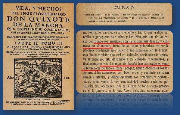 El Quijote de Avellaneda publicado en Tarragona en 1614 decía ésto de la nación española y los Reyes de España: