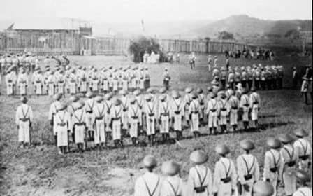 Foto de 1892 en Momungan, lanao del norte en la isla de Mindanao (filipinas). Las tropas españolas honran en masa a Alfonso XII en su cumpleaños