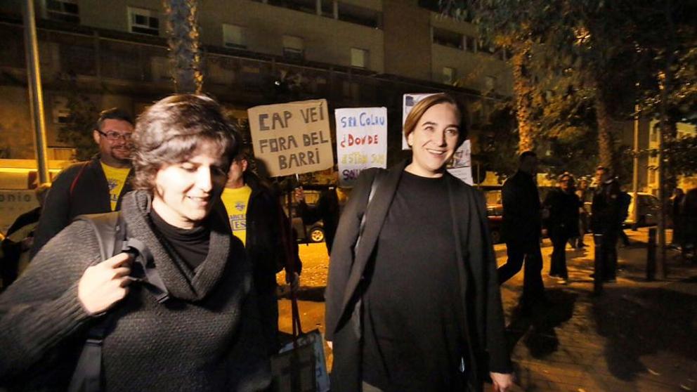 Vecinos del barrio de la Barceloneta recibieron ayer por la tarde a la alcaldesa Ada Colau con pancartas confeccionadas con fotografías de esta dirigente en sus tiempos de activista sociale, disfrazada de superheroína.