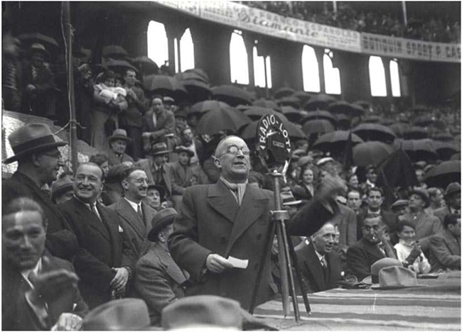 Humbert Torres durant un durant un míting electoral d´Esquerra Republicana de Catalunya a la Plaça Monumental de Barcelona. A la seva esquerra, assegut, Lluís Compans. 1933.