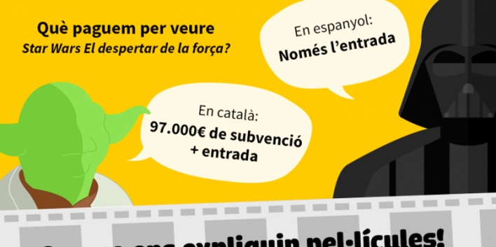 Star Wars s’estrena als cinemes i ho fa també amb versió en català. Segons dades del Departament de Cultura, en aquest cas, el doblatge de la pel·lícula en català ha costat 97.000 euros, que ha assumit la Generalitat de Catalunya. La Plataforma per la Llengua denuncia que Disney no ha difós el tràiler en català per Internet. (toma ya, què esperaven. O es que pensen que son babous o què). A més a més no està previst que Disney retorni cap dels seus guanys a l’Administració catalana. Aquesta es la gran política econ`mico-cultural de la Generalitat.