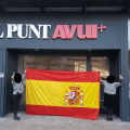 Empiezan a aparecer fotos que hubieran sido insólitas hace tan solo unos meses. Estas, por ejemplo, muestra a dos mujeres que despliegan una gran bandera española ante la sede del diario indepententistas El Punt-diari. Y de paso brindan con cava.