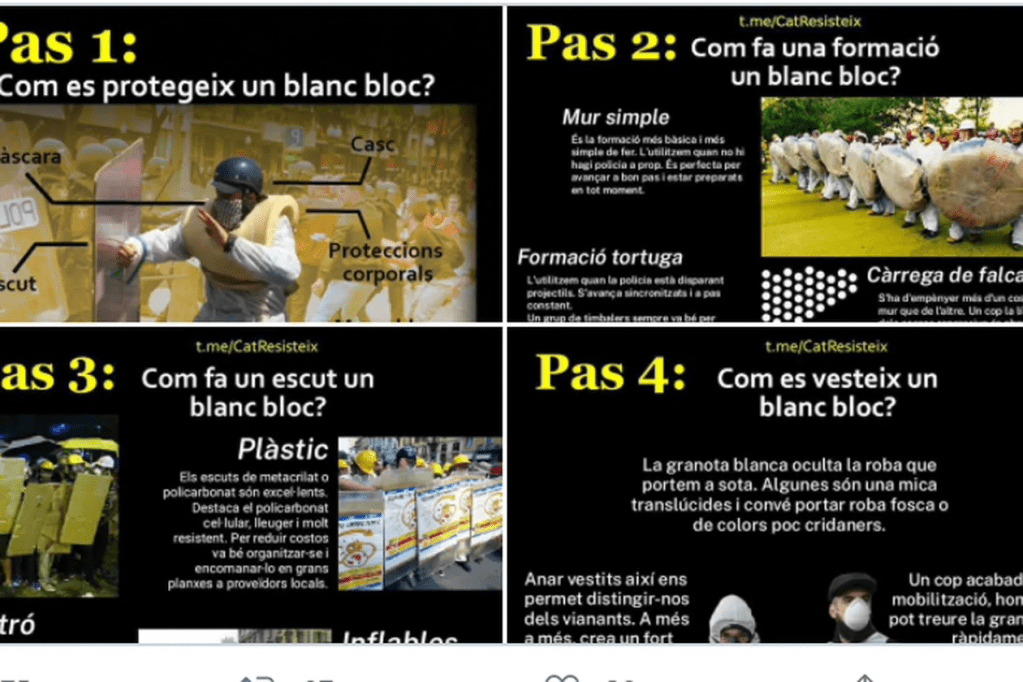 Blanc Bloc es la última «parida» del independentismo radical. Por Twitter, se han presentado así: «No somos Tsunami Democràtic, no somos políticos ni botiflers [traidores]. Somos Blanc Bloc y haremos lo posible (de manera organizada y siguiendo las estrategias de Tute Bianche) para provocar la declaración unilateral de independencia (DUI)».