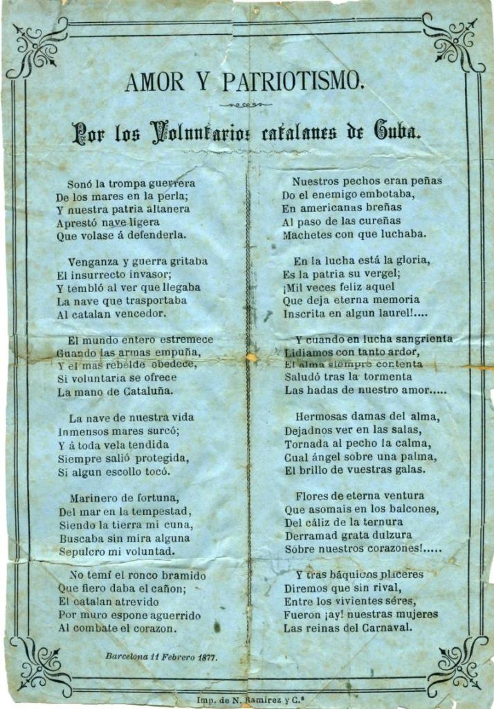 Poema Anónimo dedicado a los voluntarios catalanes de Cuba. Hoja volante fechada en 1877