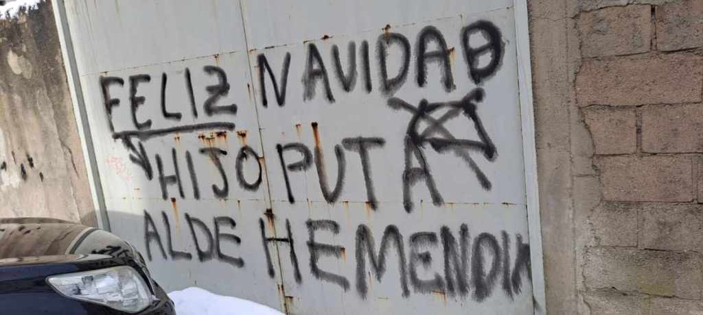 En otra de las pintadas dirigidas a los agentes del Cuerpo el lema ‘Feliz Navidad hijo de puta’ se completa con un ‘Alde hemendik’ (Marchaos de aquí) junto al dibujo del tricornio bajo un aspa. Esta no es la primera ocasión en la que la familia de la joven sufre la aparición de pintadas y pancartas frente a su vivienda y que se han sucedido a lo largo de los últimos cinco años.
