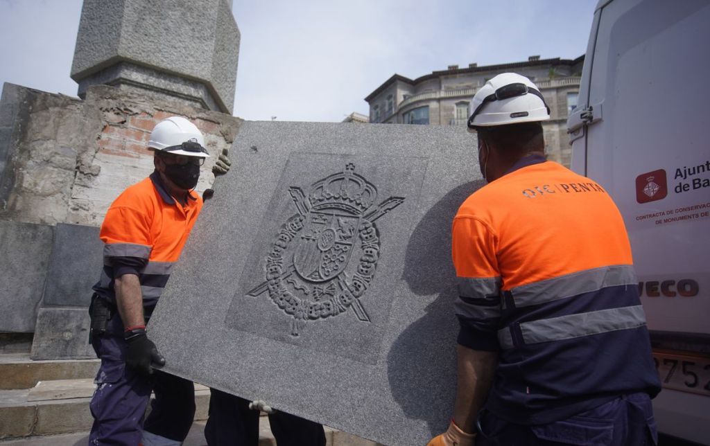 El Ayuntamiento de Barcelona retiró este sábado el escudo de Juan Carlos I del obelisco de la plaza Cinc d’Oros (antes de Juan Carlos I, antes de la Victoria) coincidiendo con la conmemoración del 90 aniversario de la proclamación de la Segunda República.