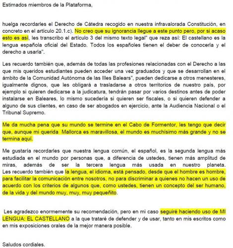 Ante la carta enviada por la Plataforma per la Llengua a todos los profesores de la Facultad de Derecho de la UIB, en la que les anima a usar más el catalán, la respuesta de una de las docentes ha sido otra misiva en la que afirma: «Me da mucha pena que su mundo termine en el Cabo de Formentor, les tengo que decir que, aunque mi querida Mallorca es maravillosa, el mundo es muchísimo más grande y no se termina aquí».
