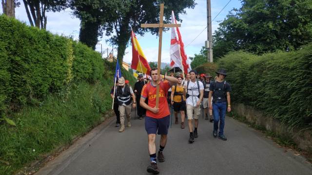 Una de las cosas que más me llamó la atención era como vibraban en los pueblos las gentes asturianas al paso de los más de 400 peregrinos, jóvenes en una buena proporción y muchas familias con niños pequeños que valientemente caminaron. Muchos de ellos portaban con orgullo estandártes y banderas de España con el Sagrado Corazón de Jesús, con la Cruz de San Andrés e incluso con la bandera de la Santa Inquisición, que llevábamos en el Capítulo de Nuestra Señora de Monserrat. Cada Capítulo llevaba presidiendo una Cruz. Incluso en la propia ciudad de Oviedo llamó mucho la atención la presencia de los numerosos peregrinos y la gente se emocionaba al igual que en los pueblos y casas rurales.