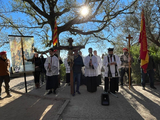 Ens hem aplegat en aquesta plaça amb el cor travessat pel compungiment de la profanació, el passat 14 de gener, del Monument del Requeté jacent que encapçalava el Mausoleu del Terç de Montserrat: una terra santa on descansen les restes dels catalans fidels a la Tradició, que van oferir-se per la restauració de la Religió i de la Pàtria. Els autors d’aquesta salvatgeria heu humiliat als fills espirituals dels Macabeus, tal com es llegeix als versicles bíblics que envolten la cripta on reposen. La nostre amargor és versemblant a l’abominació de la desolació que assereix el Profeta Daniel, quan va contemplar en una visió com era blasmat el Temple de Jerusalem amb sacrificis pagans. Creguem que els responsables de emparar la nostra Patrona, la “Moreneta”, han comès un greu sacrilegi: espigolar la memòria dels nostres màrtirs caiguts a la Creuada del 36.