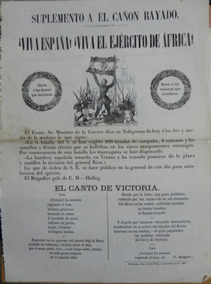 Especialmente interesante es el caso de Victor Balaguer, el más importante escritor catalán de aquel momento y autor principal de la Renaixença, ( además fue político liberal y llegó a ser ministro) quien escribió un largo poema titulado “A la Bandera Española” cuyo título lo dice todo. Este poema se leyó ante una multitud en la plaza de San Jaime de Barcelona después de la batalla de Tetuán provocando la euforia patriótica colectiva. Además de este poema Víctor Balaguer escribió un grueso libro de más de 700 páginas describiendo con detalle todos los avatares militares de la guerra, titulado “Jornadas de Gloria. Los españoles en África”, rebosante de patriotismo hispano.