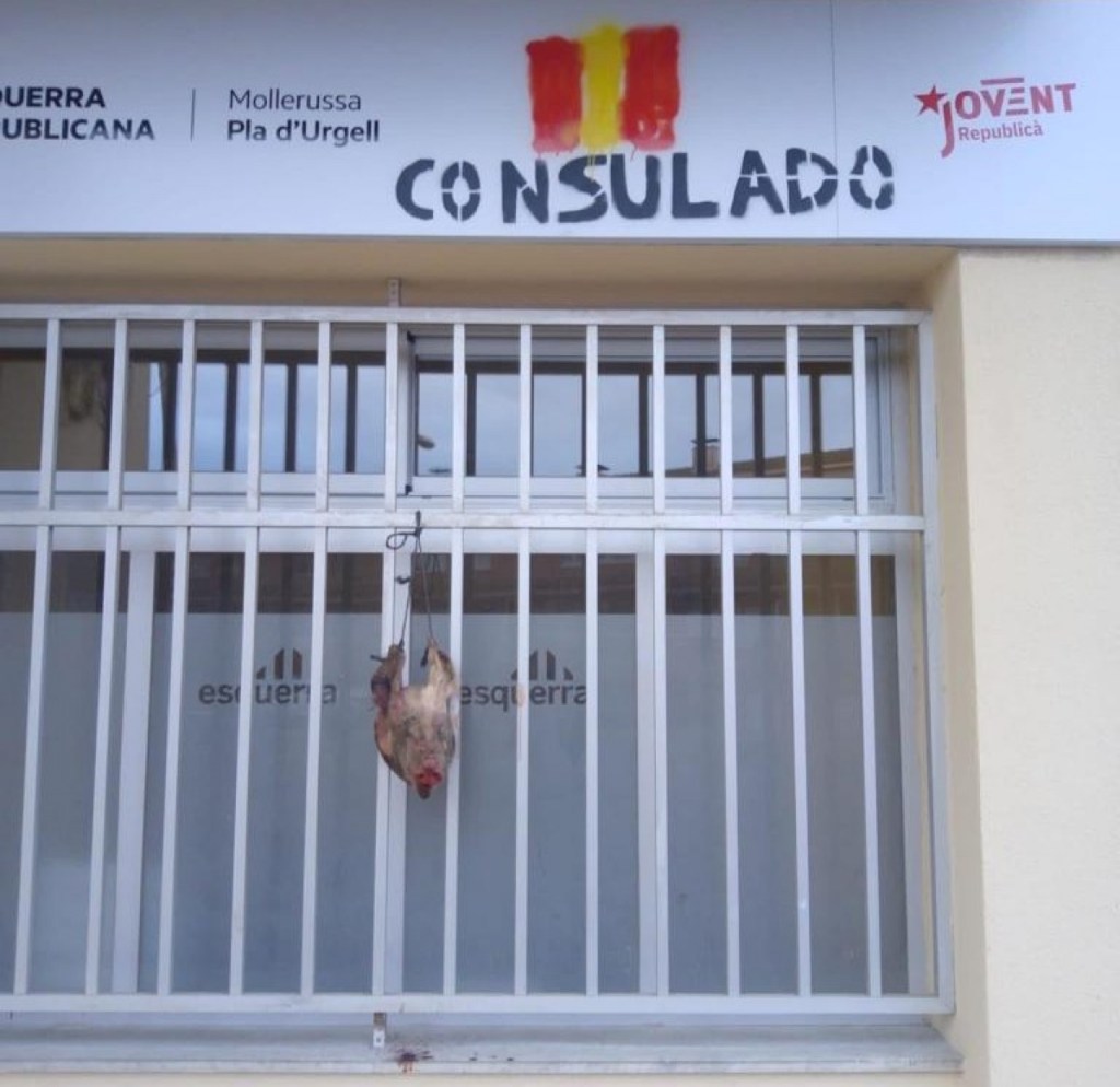 La sede de ERC en Mollerussa fue atacada la semana pasadapor independentistas. En la fachada del local les pintaron la bandera española y con la palabra «consulado». Los independentistas que se consideran más «puros», también colgaron una cabeza de cerdo en la puerta.