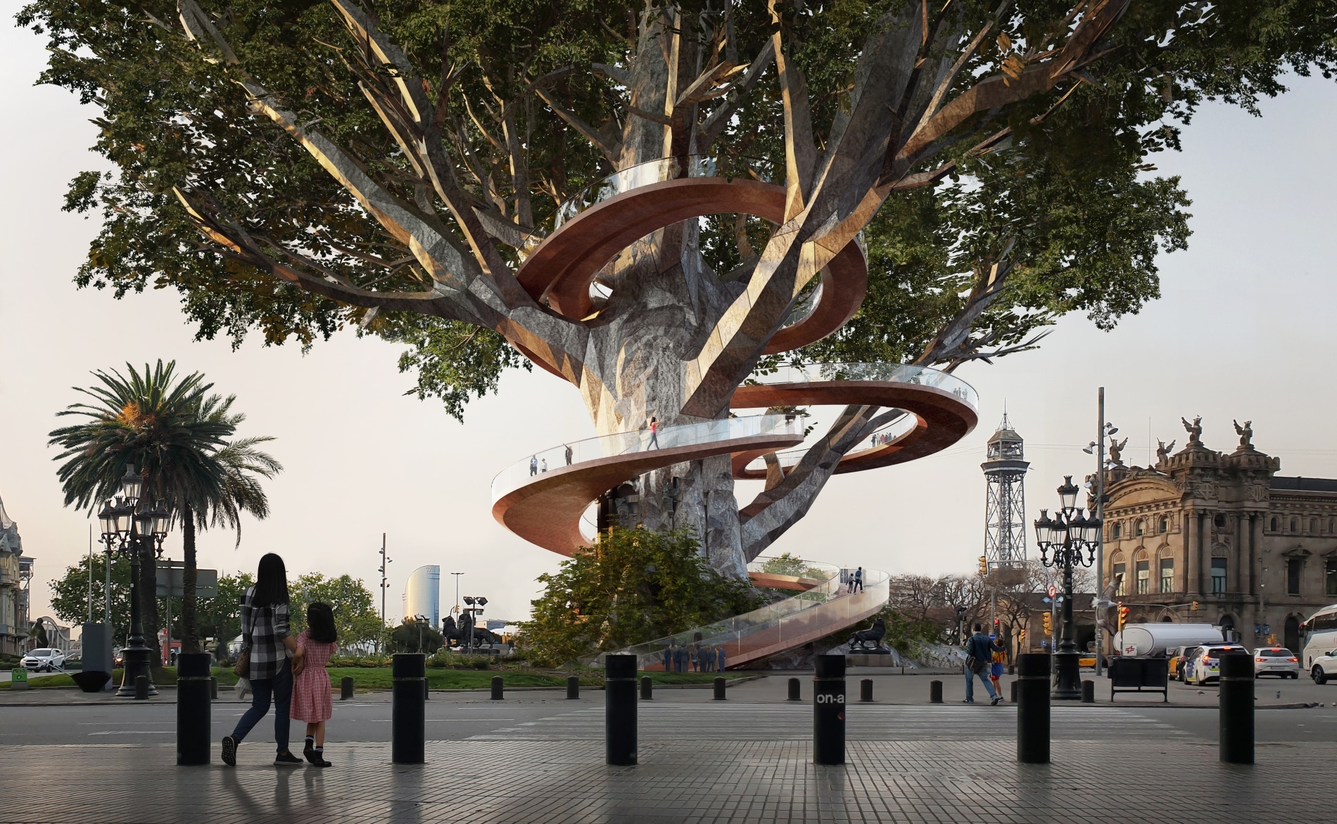 Uno de los elementos más destacados de la propuesta es la cobertura del monumento a Colón con un gran árbol metálico que representa a una encina, el árbol más habitual en Cataluña.
