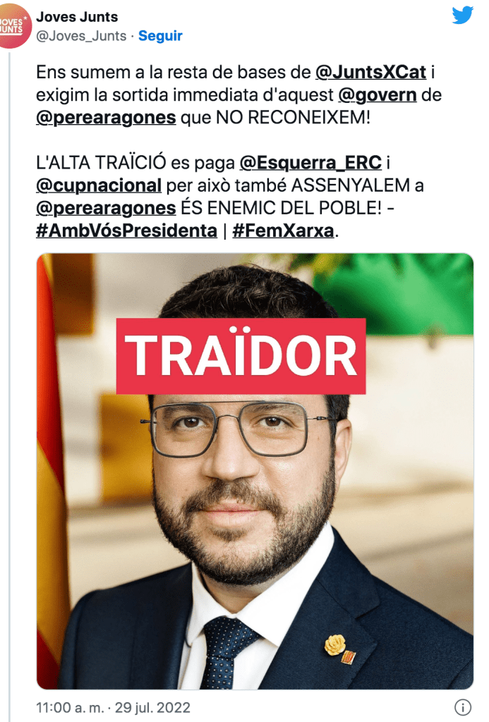Las juventudes de Junts per Catalunya, Joves Junts, han comunicado -a través de su cuenta de Twitter- que el presidente de la Generalitat, Pere Aragonès, es un «enemigo del pueblo» y un «traidor» que «no reconocemos».