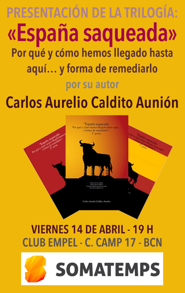 Viernes 14 de abril: Presentación del libro «España saqueada», de Carlos Caldito Por Somatemps el 4 abril, 2023 • ( 0 ) Viernes 14 de Abril, a las 19 h. Presentación de la trilogía «España saqueada» por su autor: Carlos Caldito Comparte esto: Compartir en X (Se abre en una ventana nueva) X Compartir en Telegram (Se abre en una ventana nueva) Telegram Enviar un enlace a un amigo por correo electrónico (Se abre en una ventana nueva) Correo electrónico Comparte en Facebook (Se abre en una ventana nueva) Facebook Compartir en WhatsApp (Se abre en una ventana nueva) WhatsApp Compartir en LinkedIn (Se abre en una ventana nueva) LinkedIn Imprimir (Se abre en una ventana nueva) Imprimir Me gusta Cargando...‹ Cachondeo: La `exiliada´ Marta Rovira vendrá a España para hacer campaña el 28-MVídeo Presentación «DESPERTA. Red sociocultural» (parte 1) ›Categorías:ACTIVIDADES