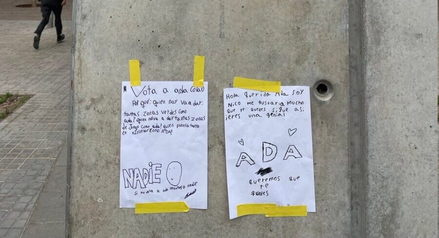 Tres hojas más adheridas en otra pared contienen como mensajes: «Votad a Ada Colau. Se lo merece. Está trabajando mucho. Y queremos poder estar libremente en los parques», «Queremos que la alcaldesa se quede. Está trabajando muy duro. Votadla, por favor», y «Vota a Ada Colau como alcaldesa. Para alcaldesa por un futuro mejor».