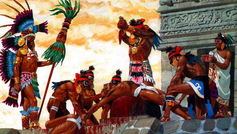 Los aztecas eran sólo una pequeña tribu que fue abriéndose paso frente a otras tribus y se transformó en algo así como un Imperio de mar a mar en lo que es el centro del actual Méjico. Para saciar el hambre de su dios secundario, los aztecas le ofrecían la sangre de los apresados en las batallas. Las mejores partes del sacrificado eran entregadas al propietario del prisionero (aquel que lo capturó en la batalla) para comérselas en un banquete familiar, las sobras eran para las masas que preparaban un guiso, y los huesos eran echados a los pumas, los lobos y los jaguares para que fuesen roídos. En Tlaloc los niños eran sacrificados al dios de la lluvia y las mujeres a la diosa madre Xilonen.