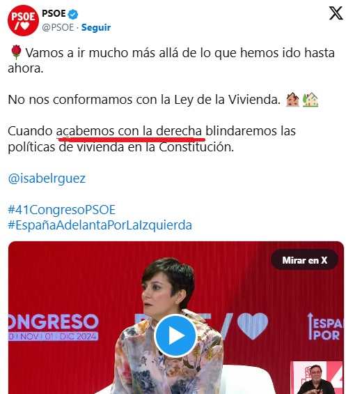 El tema siempre lo sacan para sus bases. Debe ser que no hay cosa que excite más la mente de una charo, ni que le erice más el bigote, que la idea «épica» de acabar con la derecha. Así se explica que en el reciente Congreso del PSOE, una tal Isabel Rodríguez que dice ser ministra, haya sacado a pasear el tema. Y tan ministra no será, porque dice ser ministra de Vivienda, pero ocupa más tiempo en amenazar con acabar con millones de votantes que en construcción de vivienda. Aunque no descarto que tenga un plan secreto en el cajón y nos sorprenda con un gran plan de renovación de vivienda. Derruir toda la vivienda construida en los oscuros años de la dictadura e instalar preciosos y ecosostenibles contenedores. Al más puro estilo canario. Con toda clase de lujos. 10 metros cuadrados, algunos incluso con una ventana. Y otros con agua gratis y renovable al caer directa de la gotera a la pica. Pero mejor no bromear, porque quizás les esté dando ideas.