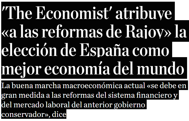 Muchas vueltas y mucho bombo han dado los medios abrevados al artículo de The Economist que señala a la economía española como una de las mejores del mundo y en cabeza de los países europeos. Al jarro de agua fría ya le han hecho menos caso:
