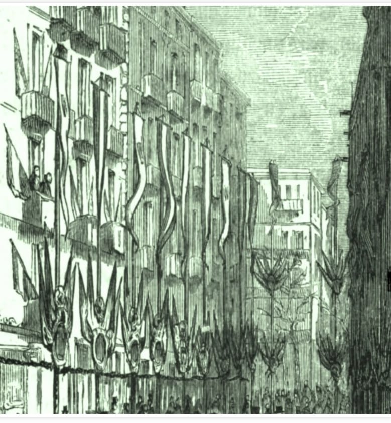 Ya vimos las multitudinarias celebraciones patrióticas en Barcelona y Cataluña por la victoria española contra los marroquíes, en la batalla de Tetuán y la consiguiente toma de esta ciudad de Marruecos, en febrero de 1860. Veamos algunos detalles más. El célebre literato catalán Víctor Balaguer, testigo directo de aquellos hechos los describe en su libro sobre aquella guerra hispano marroquí «Jornadas de gloria o los españoles en África». Durante la masiva celebración en Barcelona por aquellos hechos nos dice refiriéndose a los adornos de los balcones literalmente que «miles de banderas españolas adornaban las calles» y nos habla de las espectaculares decoraciones de las casas en todo el centro de la ciudad.