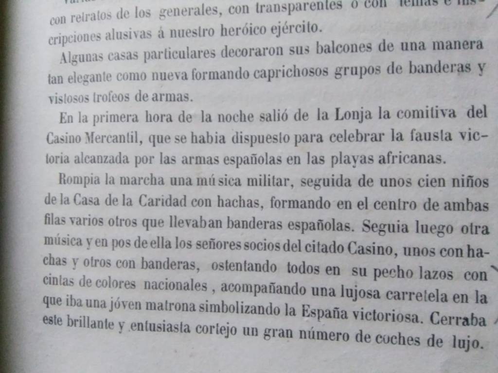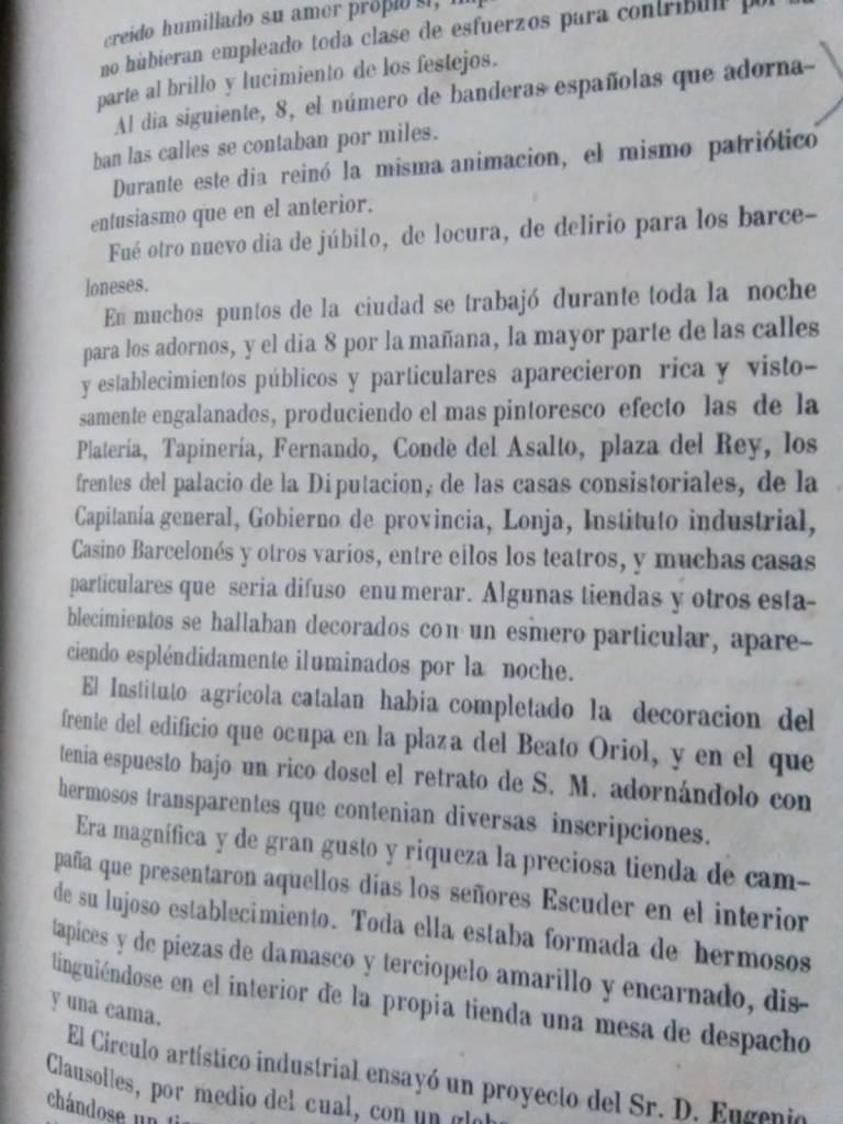 Y entre otros muchos datos nos describe los desfiles de niños de la antigua Casa de la Caridad (donde actualmente está la iglesia de Montealegre, en el centro de Barcelona) con hachas y banderas españolas o a los burgueses del Casino Mercantil, marchando portando lazos en el pecho con cintas con la bandera española, entre otras muchas fiestas y demostraciones de alegría popular e institucional.
