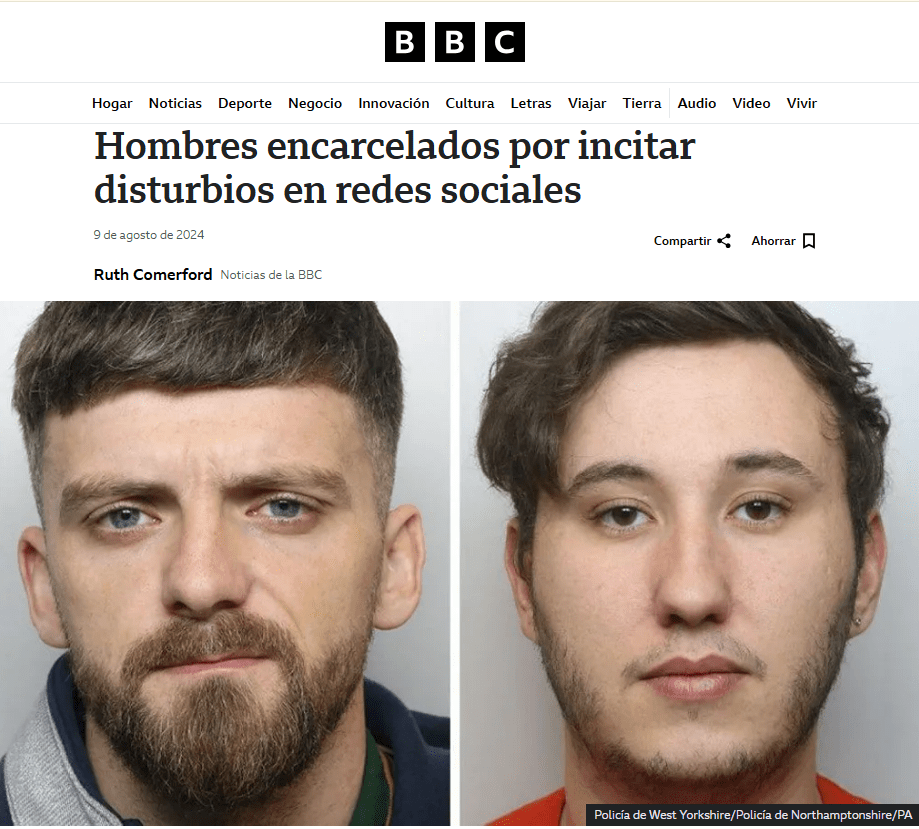 Abundan los casos de simples comentarios o gestos jocosos duramente castigados Por ejemplo Jordan Plain, de 30 años, de la ciudad de Leeds, ha sido condenado a 8 meses de prisión por hacer «gestos racistas» en una manifestación. En Reino Unido las condenas a prisión de menos de un año implican la entrada efectiva en la cárcel, a diferencia de lo que ocurre en el Código Penal español.