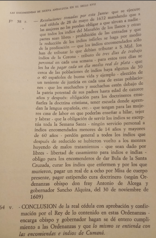 Estos párrafos corresponden a un fragmento del libro «Las Encomiendas de la Nueva Andalucía en el siglo XVII», una importante obra en cuatro volúmenes publicada en su día, en los 70, por la Academia Nacional de Historia de Venezuela y que recopila una gran cantidad de documentación procedente de archivos de América y España, sobre la legislación del periodo virreinal. Venezuela perteneció en aquellos tiempos al llamado Virreinato de Nueva Granada.