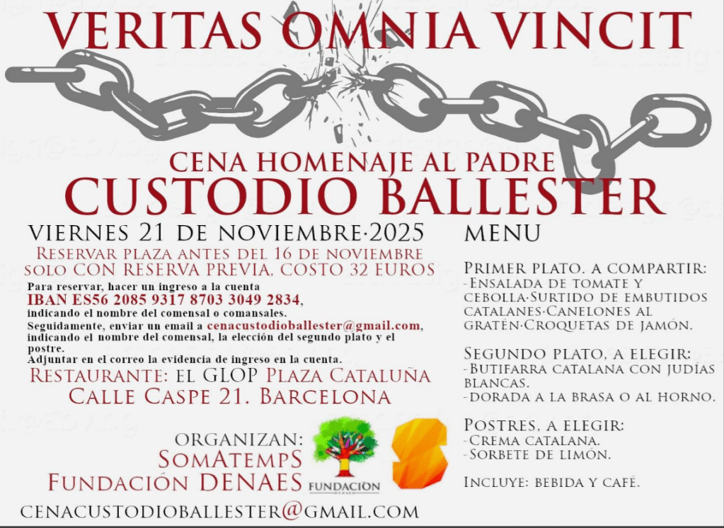 El próximo viernes 21 de noviembre, a las 21:15 se celebrará en Barcelona, en el restaurante El Glop (Caspe, 21), una cena de homenaje al padre Custodio Ballester.