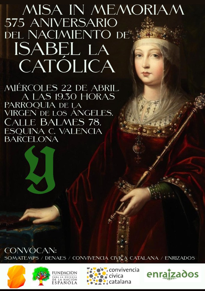 Misa in memoriam. 575 aniversario del nacimiento de Isabel la Católica. Barcelona, 22 de abril Por Somatemps el 20 abril, 2026 • ( 0 ) Comparte esto: Compartir en X (Se abre en una ventana nueva) X Compartir en Telegram (Se abre en una ventana nueva) Telegram Enviar un enlace a un amigo por correo electrónico (Se abre en una ventana nueva) Correo electrónico Comparte en Facebook (Se abre en una ventana nueva) Facebook Compartir en WhatsApp (Se abre en una ventana nueva) WhatsApp Compartir en LinkedIn (Se abre en una ventana nueva) LinkedIn Imprimir (Se abre en una ventana nueva) Imprimir Me gusta Cargando...‹ Contra la Leyenda Negra. Juan Valverde de Amusco, un médico español del Siglo XVICategorías:ACTIVIDADES, HISPANIDAD